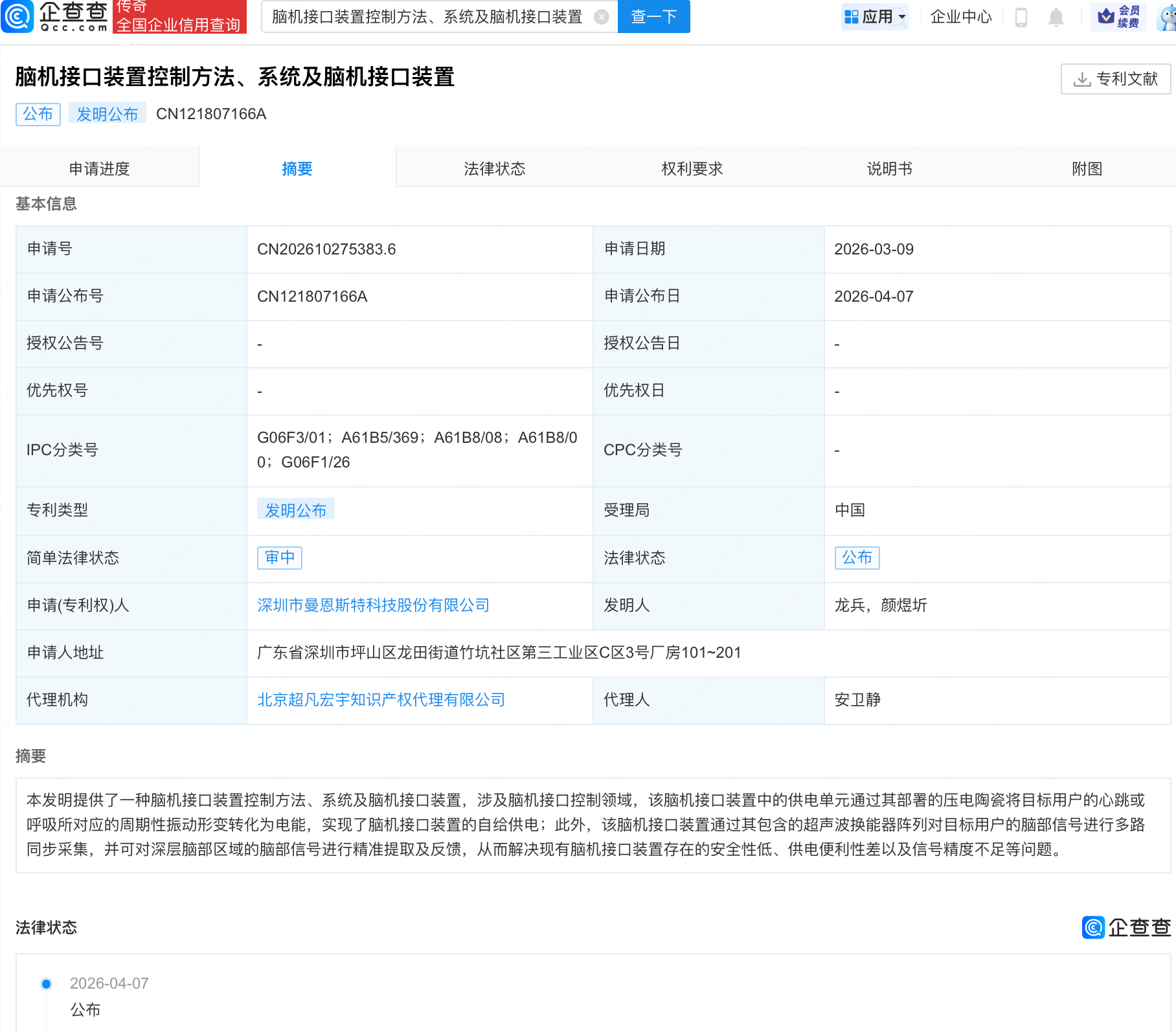 企查查APP显示,近日,曼恩斯特(301325.SZ)“脑机接口装置控制方法、系统及脑机接口装置”专利公布。企查查专利摘要显示,本发明涉及脑机接口控制领域,该脑机接口装置中的供电单元通过其部署的压电陶瓷将目标用户的心跳或呼吸所对应的周期性振动形变转化为电能,实现了脑机接口装置的自给供电;此外,该脑机接口装置通过其包含的超声波换能器阵列对目标用户的脑部信号进行多路同步采集,并可对深层脑部区域的脑部信号进行精准提取及反馈,从而解决现有脑机接口装置存在的安全性低、供电便利性差以及信号精度不足等问题。