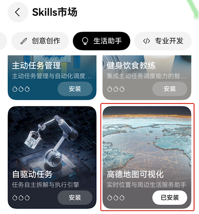 具体怎么用?打开小艺Claw,点击底部工具栏的“Skills市场”,在“生活助手”分类里找到“高德地图可视化”这个Skill,安装即可。