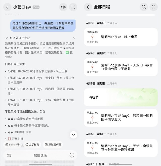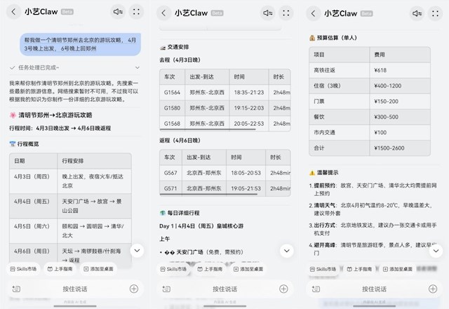 我的清明节假期就直接交给了小艺Claw,我直接说出自己的需求:“4月3号晚上从郑州出发,6号晚上再从北京回郑州”。TA立刻整合交通、景点、住宿等核心信息,制定出合理的行程规划——每天去哪里玩、先逛哪个景点、坐什么交通方式、大概需要多久,都安排得清清楚楚,还会推荐当地的特色美食,特别贴心。