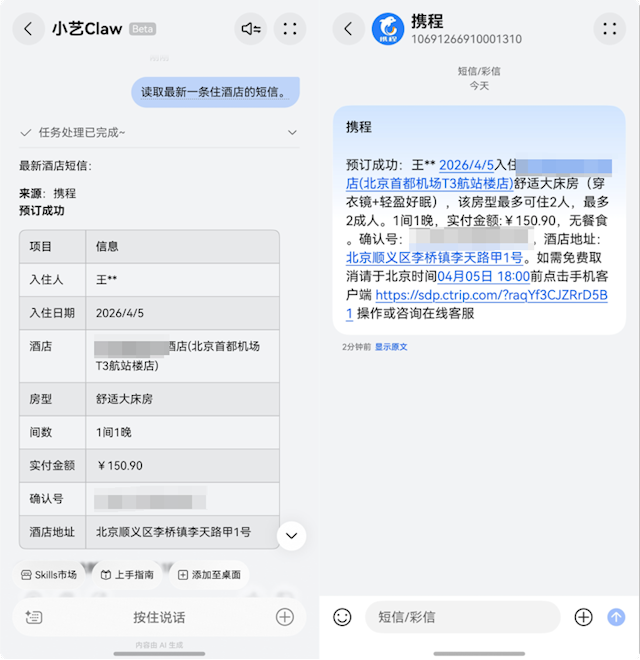 比如收到北京酒店的预订短信,只要给小艺Claw授权处理,TA就能自动解析关键信息,把入住人、日期、酒店地址、房型、金额等内容整理成清晰的表格,信息一目了然,不用再对着杂乱的短信翻找,也避免了反复切换App的麻烦。