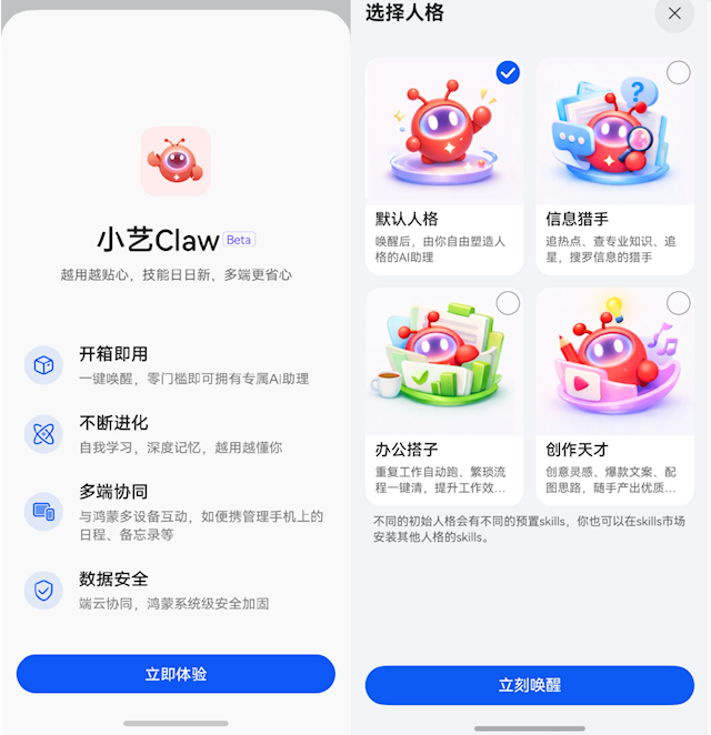 打开小艺Claw,你会看到“默认人格”“信息猎手”“办公搭子”“创作天才”四个初始人格选项。你可以根据所需唤醒相应的人格——但这只是第一步,后续还能在Skills市场给TA安装更多技能。通过不断训练,你就会收获一只越来越懂你的专属“龙虾”。